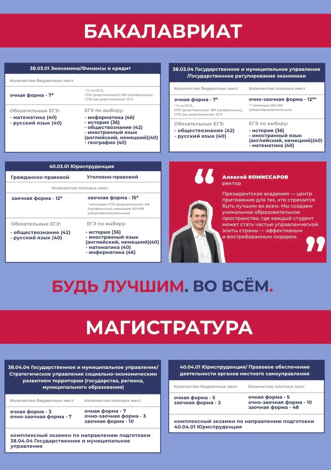 Готовишься к поступлению? Самое время изучить свои возможности в Президентской академии/Киров. В этом посте — актуальный список направлений бакалавриата и магистратуры, количество бюджетных мест и ключевые изменения в правилах приёма. Сохраняй, чтобы не потерять!