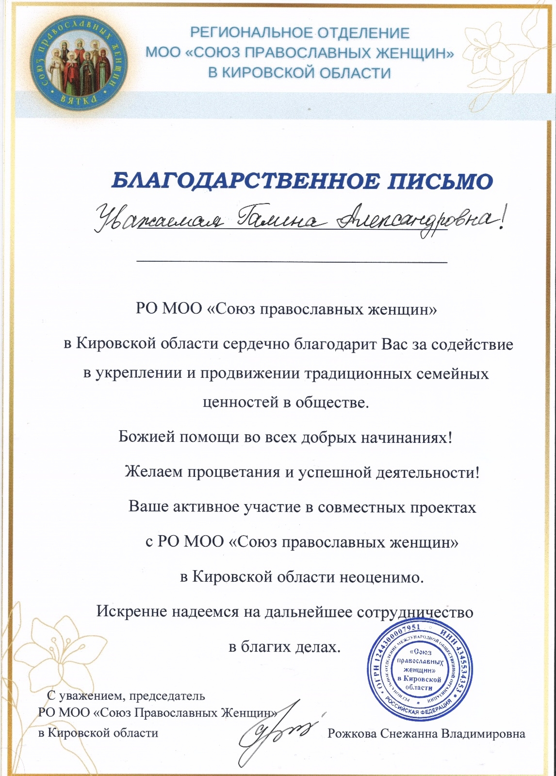- Галине Александровне – за активное участие в совместных проектах с РО МОО «Союз православных женщин» в Кировской области.