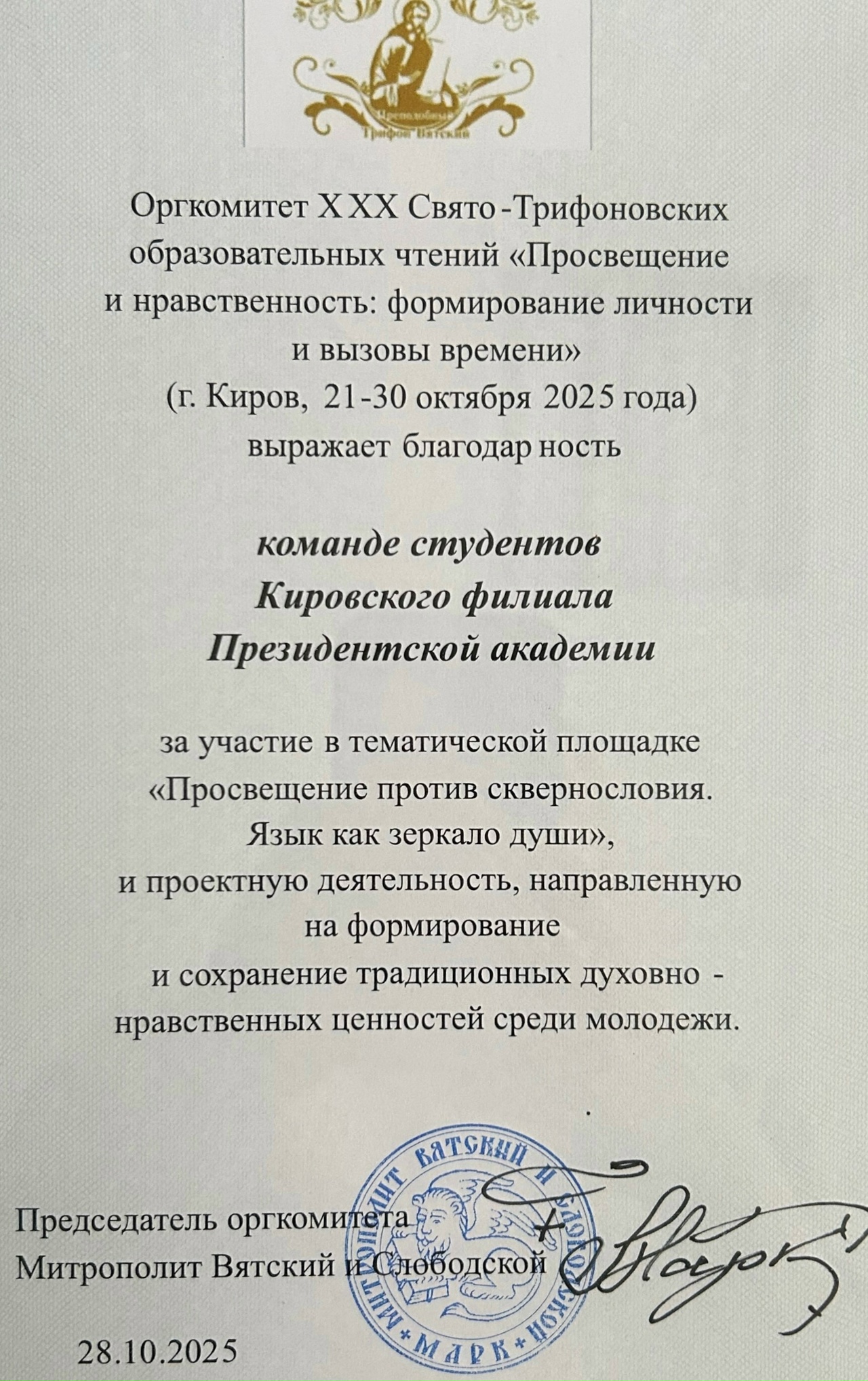 28 октября команда студентов Кировского филиала Президентской академии РАНХиГС (группы Ю-ДО-24, ГМУ-ДО-24, Э-ДО-24) приняли активное участие в тематической площадке «Просвещение против сквернословия. Язык как зеркало души».