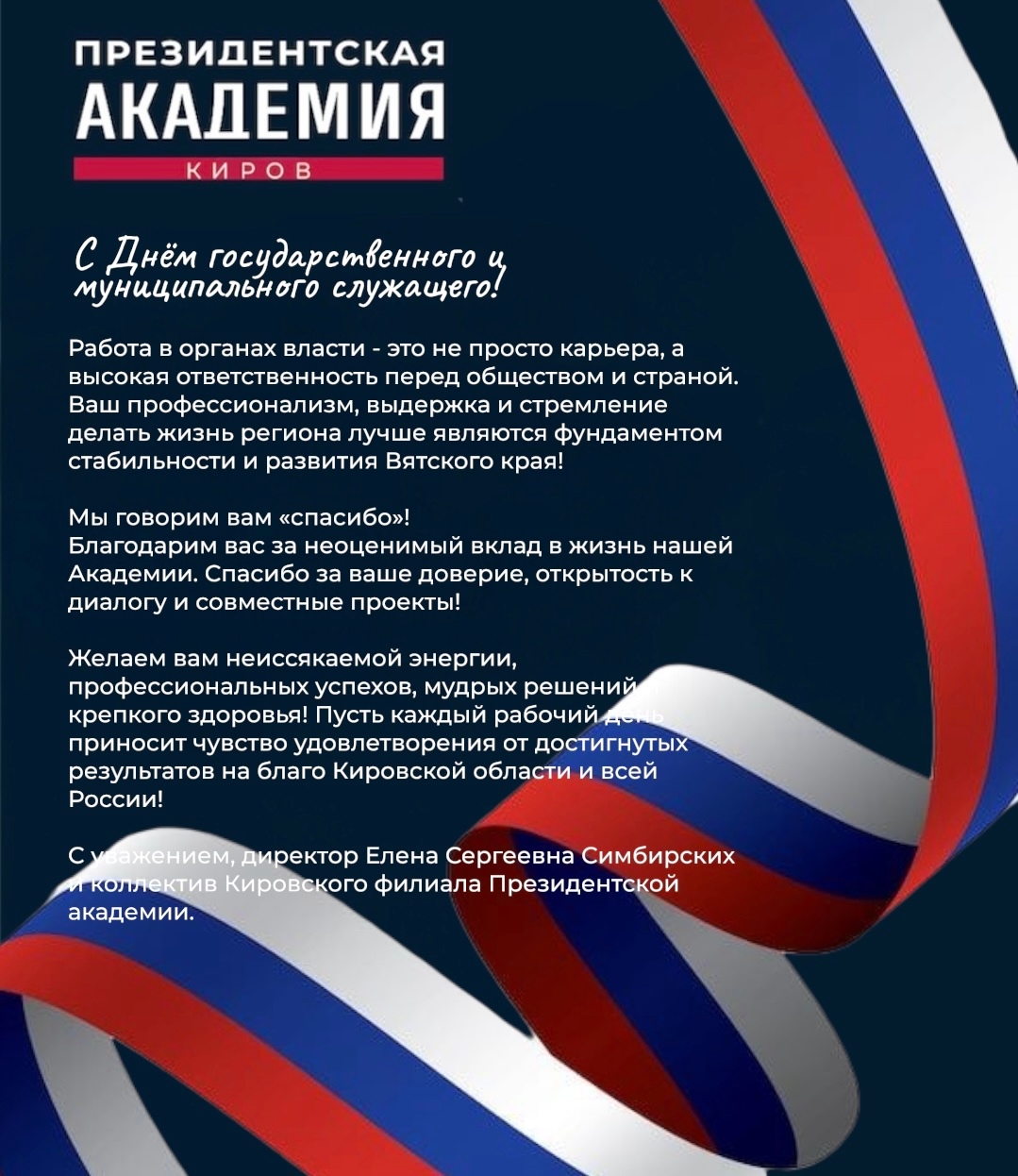 С уважением, директор Елена Сергеевна Симбирских и коллектив Кировского филиала Президентской академии.