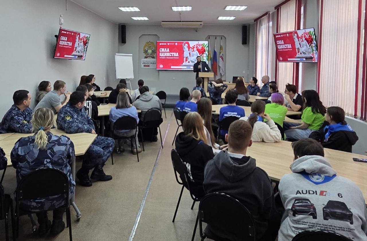 Тема встречи: «Сила единства: история и будущее России». Студенты и гости мероприятия обсудили, как на протяжении веков сплоченность разных культур и этносов становилась фундаментом мощи нашей страны и почему сегодня это единство — залог нашего успешного будущего.
