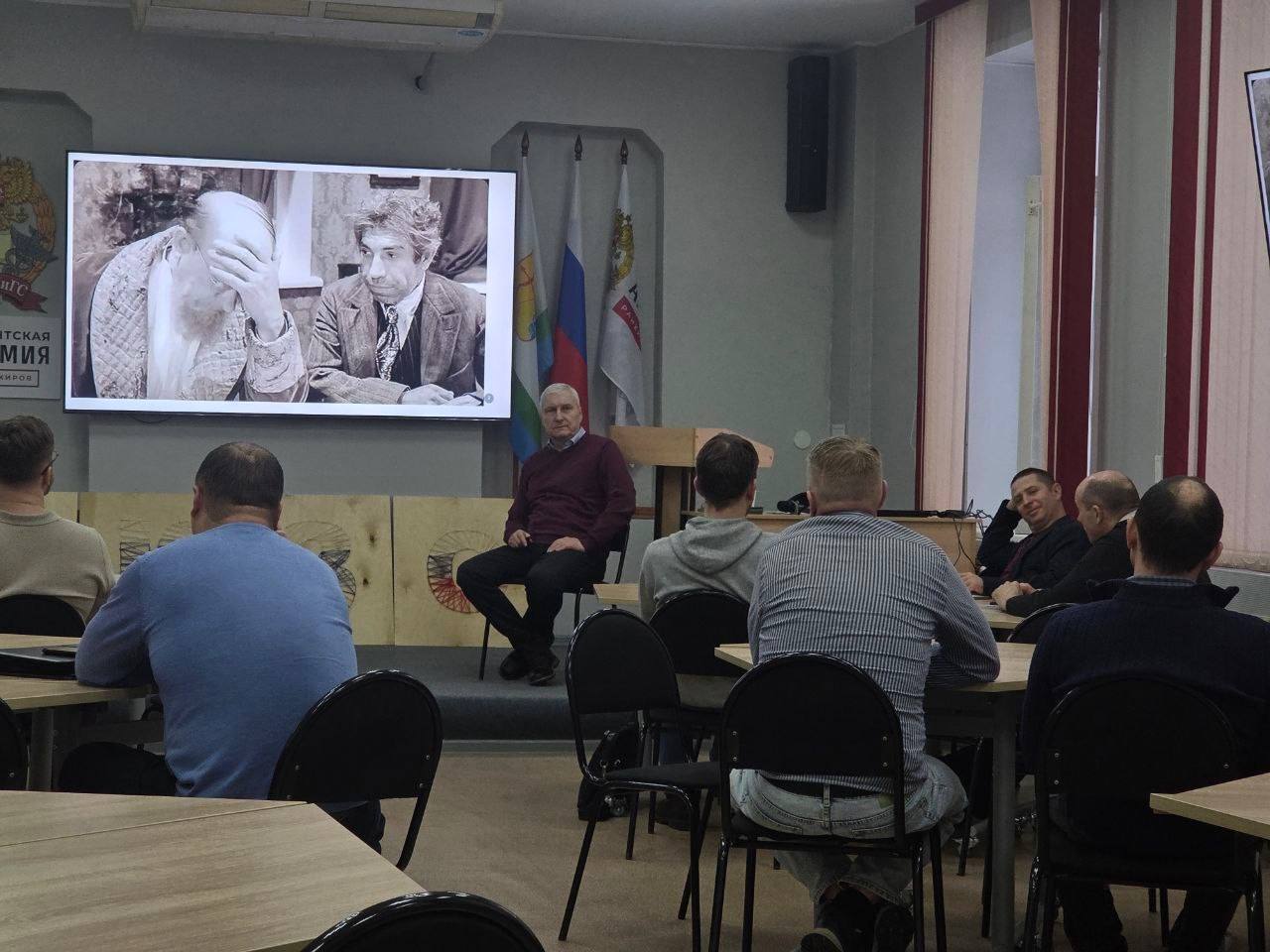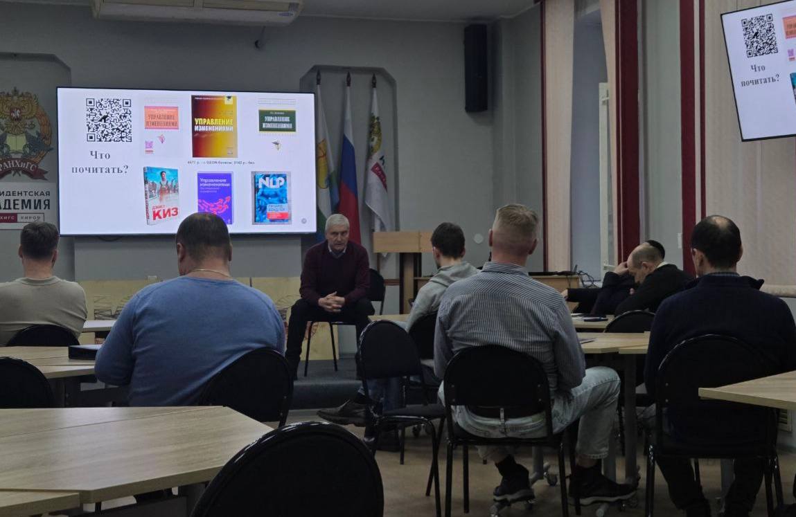 Алексей Викторович Ермолин, доцент кафедры правовых и общественных дисциплин факультета права и экономики Кировского филиал Президентской академии разобрал с бойцами психологические и структурные аспекты реформ. Понимание того, как люди проходят через перемены — ключевой навык современного руководителя.