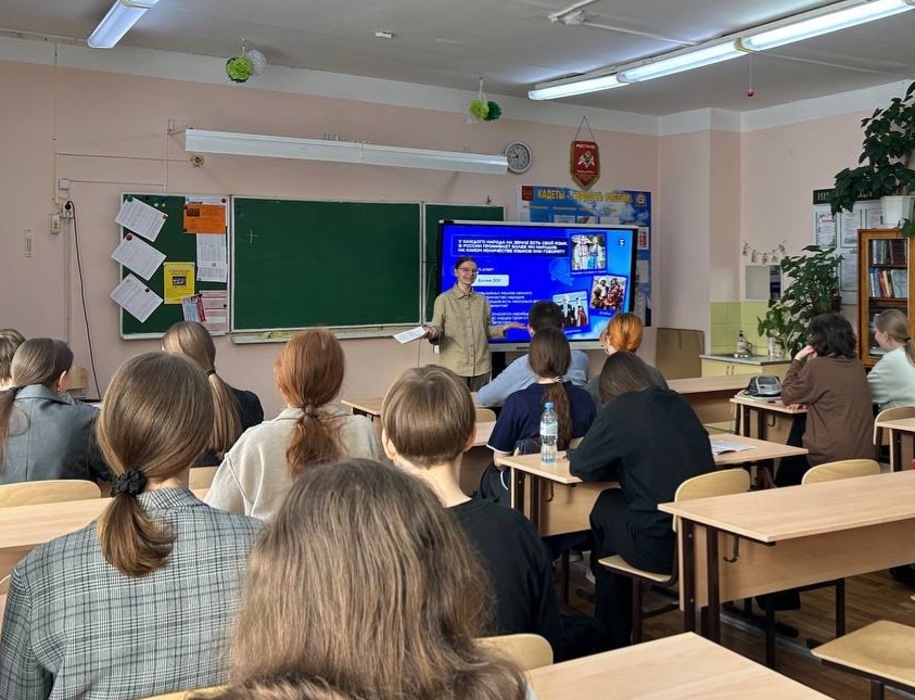 Валерия Шишкина (гр. Э-ДО-24) и Светлана Максимова (гр. ГМУ-ДО-24) провели для школьников лекцию на тему «Год единства народов России». Говорили о том, что нас объединяет, о силе многонациональной страны и о том, как важно беречь общие ценности.
