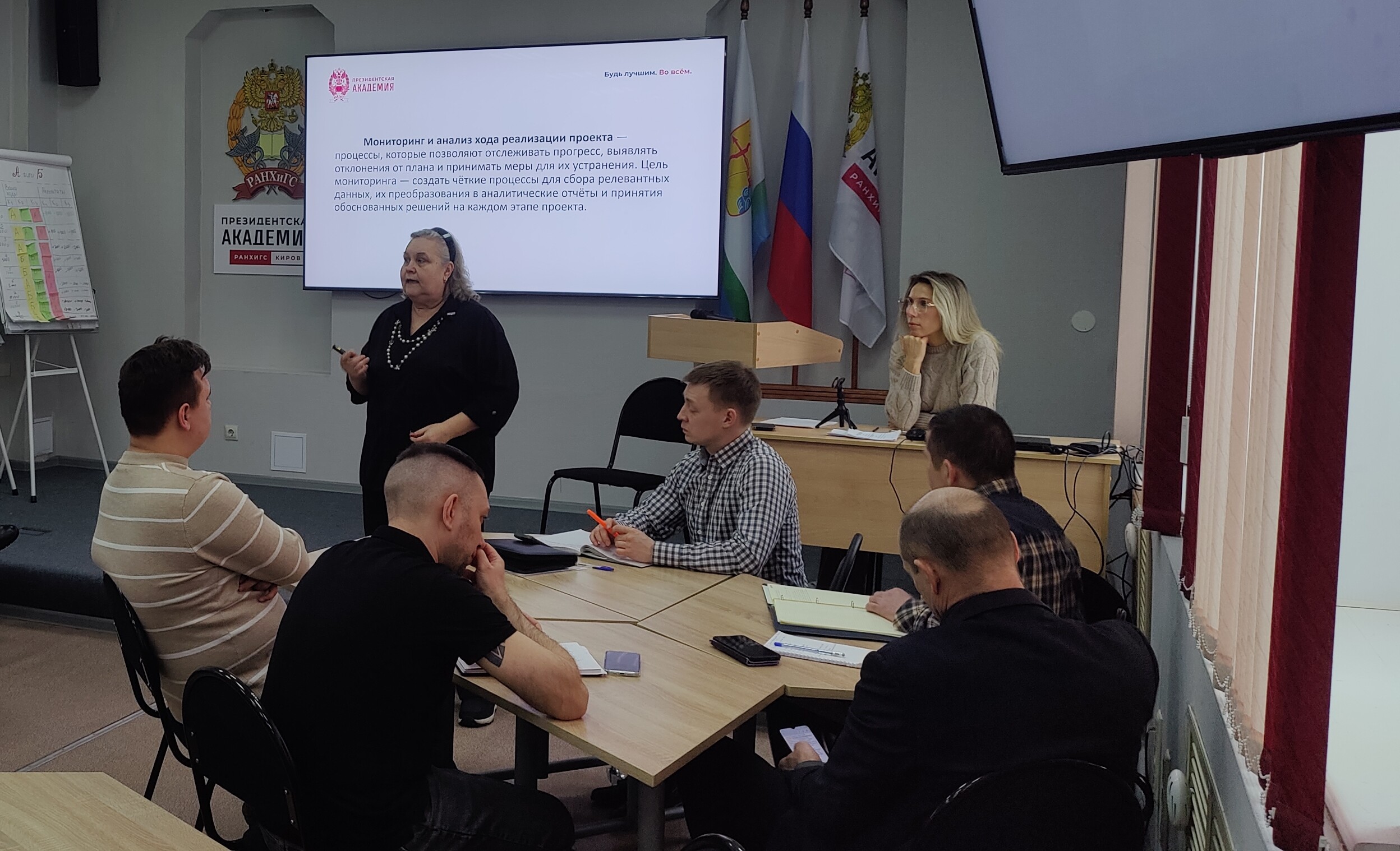 Под руководством Е.А. Русакова, зав. кафедрой экономики и государственного и муниципального управления факультета права и экономики Кировского филиала Президентской академии и Л.В. Крючкова, доцента кафедры экономики и государственного и муниципального управления факультета права и экономики Кировского филиала Президентской академии, участники осваивали технологии контроля. Разбирали, как правильно анализировать ход реализации проектов, вовремя замечать риски и добиваться поставленных целей. Для будущего управленца — это базовый «инструментарий».